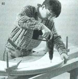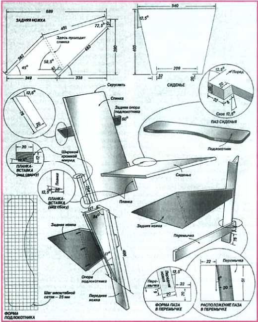 Изготовление деревянного кресла Сверяясь с чертежом кресла, разрезаем брус на планки длиной 550 мм. Для сборки задней и двух боковых стенок их понадобится 36 штук плюс несущие бруски для сиденья. Режем древесину дисковой пилой, используя стусло или упоры, продольные и поперечные. Сделать такое элегантное деревянное кресло не так сложно На краях каждого бруска размечаем и просверливаем сквозные отверстия диаметром 8 мм. Расстояние от центра отверстия до конца бруска должно составить 25 мм. Чтобы точно выдержать размеры, расстояние и перпендикуляры отверстий, применяем сверлильную стойку. Чтобы решить вопрос, как сделать деревянное кресло гладким и безопасным, торцы планок обрабатываем абразивной шкуркой, с кромок снимаем фаску. Продольные ребра брусков скругляем рубанком и тоже зачищаем шкуркой, обернутой вокруг деревянного бруска. Из такого же бруса нарезаем квадратные элементы размерами 28x28 мм (назовем их «шашки»), которые будут отделять одну планку от другой, создавая решетчатую основу кресла. С ребер шашек снимаем фаску. Просверливаем в них сквозные прорези, совпадающие с такими же на концах планок. Склеиваем каждую планку с двумя шашками, вставив в отверстия направляющую шпильку, сделанную из обрезков. С краю склеиваемые заготовки выравниваем, приставив к ним рейку. Стягиваем собранные элементы струбцинами и оставляем до высыхания. Решая, как сделать кресло из дерева красивым и долговечным, обрабатываем древесину морилкой. Для этого подвешиваем заготовки на укрепленный брусок с вбитыми в него гвоздями. Гвозди продеваем в отверстия на деталях. Вместо гвоздей можно ввернуть в брусок шпильки. Морилку на планки и шашки наносим губкой. Излишки состава снимаем кистью. Просушив морилку, грунтуем планки, шлифуем нулевкой и покрываем лаком. Для сушки деталей готовим вспомогательную плиту с вклеенными в нее шкантами. На шканты укладываем окрашенные детали. В таком положении они сохнут до нужной кондиции.
