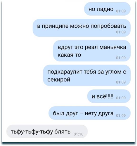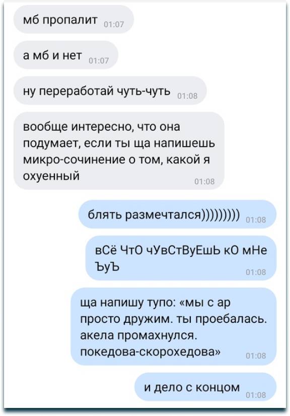 Теперь, когда у аР появилась девушка, и он почти перестал с тобой переписываться, ты спрашиваешь себя: а что это было-то? Что это было-то такое вообще? Легко замазать странную картинку непритязательными однотонными лейблами вроде «дружба» или «любовь». Легко сказать «это мой друг» или «это человек, которого я люблю» – что, по сути, будет означать одно и то же, но всё же. Что это было? Что заставляет тебя дружить с пацанами? Для парней это всё как-то само собой разумеется и не требует дальнейших пояснений. Вот я ехал на велике и разбил коленку: вот, смотри, моя разбитая коленка. Вот я очень много тренировался и натёр мозоли: вот, смотри, мои мозоли. В них столько воды, офигеть! Хочешь, сниму на видео, как они прорываются? Вот я собрал насекомых в одну банку, чтобы посмотреть, кто кого первым сожрёт. На кого сделаешь ставку? И тебе от этого дико странно, но также и дико интересно. Наверное, в этом и корень. Девочка-друг вряд ли будет посылать тебе фотки мерзостей, ей даже не придёт это в голову. Даже если это очень близкая подруга, она может очень подробно описать, как рвутся гнойники от врастающих лобковых волос, но фотографировать это она не будет – и уж тем более кому-то скидывать. Парень-друг же ответит: «Так, ща, поищу, где-то была фотка, сек». Возможно, ты сама неосознанно излучаешь энергетику девушки, которой стоит скидывать именно это. Ведь ты листаешь ленту инстаграма и не можешь поверить, что подобные сообщения присылают Яне в кустах сирени или Веронике с лавандовыми нарощенными ногтями. В то же время, милостивый Господь раз за разом уберегает тебя от дикпиков – и в этом видится то ли божье благословление, то ли какая-то интересная закономерность, которую можно было бы статистически проанализировать. Проследить, так сказать, корреляцию между кругом общения и отсутствием в личке дикпиков. Телефон вибрирует, аР скинул фотку. Есть некое радостное ожидание: что же там будет? Эксперимент по раздавливанию куриных яиц? Мем про пердёж? Бутылка пива на пузе в лучах закатного солнца? Но нет. Там селфи счастливого аР в обнимку с Аней. Они валяются на кровати в обнимку под пледом, хавают варёные креветки и чипсы «Лейс» с сыром, смотрят «Крепкий орешек 2». И одна часть тебя, конечно же, радуется за аР. Очень-очень радуется, потому что именно об этом он мечтал уже несколько лет. Но другая часть тебя немного тихо и немного печально улыбается: «Эх! Я опять потеряла Друга».
