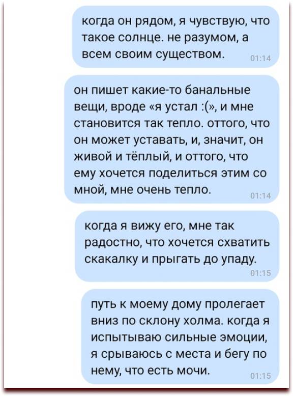 Моя подруга Женя как-то сказала: «Здоровые отношения – это когда тебе и без него хорошо, а с ним прям отлично. Но если его нет рядом, то тебе нормально. Ты чувствуешь, что ты личность сама по себе. И вы вместе, потому что вам хорошо, а не потому, что друг без друга вам смертельно плохо. Если когда его нет, тебе так плохо и больно, что хочется умереть; если он – центр всего твоего существования; если ты не можешь спокойно работать, учиться, заниматься своими делами, потому что постоянно думаешь о нём – это нездоровые отношения.» Так вот если вы, прочитав это стихотворение, подумали: «Как же жизненно!» – возможно, вам необходима психологическая помощь. Или, как минимум, задать себе вопрос: «Почему именно этот человек? Почему я люблю именно его? Какие конкретно черты характера/ невербальные сигналы/ слова притянули меня?» И тогда, возможно, вам откроется чан ваших непроработанных психологических проблем – и это хорошо! Потому что лучше осознать их, проработать и почувствовать облегчение, чем раз за разом вступать в похожие отношения, приводящие к вашему саморазрушению и бесконечным страданиям.Очень важно! Уходите от психолога/ психотерапевта, если вы чувствуете, что это не ваш человек и/ или вы сомневаетесь в подходе. Я около полугода на третьем курсе ходила к бесплатной психологине в МГИМО. Когда я пришла к ней в сентябре, мне было средне-паршиво. К ноябрю я хотела суициднуться. До сих пор помню её удивлённый вопрос: «Мария, я не понимаю! Вы же такая успешная умная девушка! Не понимаю, в чём ваша проблема?» Мне хотелось наорать на неё: «ЗА ЭТИМ Я К ВАМ И ПРИШЛА!» У меня такой склад ума, что мне гораздо проще жить, действовать и выстраивать стратегии, когда всё разложено по полочкам и для всего есть чёткие термины. Я безуспешно просила психологиню дать однозначный ответ, есть ли у меня какое-то расстройство или же я здорова, а проблема в самих обстоятельствах. На это она загадочно, подобно Гусенице из «Алисы в Стране Чудес», вещала: «Ну, знаете ли, норма – понятие относительное… Все мы в своём роде нормальны… И в своём роде ненормальны…» Я не понимаю, в чём была проблема сказать: «У Вас ОКР, но медикаментозное лечение пока не требуется. Просто почитайте в интернете, что это такое, чтобы понимать природу иррациональных поступков, которые Вы иногда совершаете. Если хотите, давайте я Вас перенаправлю к психотерапевтке в соседнем кабинете для уточнения диагноза». Золотое правило: если вам кажется, что от походов к психологу вам всё сильнее хочется умереть – уходите и ищите другого специалиста. Другое дело, когда вы в ходе работы с психологом обнаруживаете в себе чан непроработанного психологического дерьма, которое влияет на вашу повседневную жизнь, хотя вы о нём забыть забыли или не замечали никогда. Тут уж надо попыхтеть и проработать – иначе будет преследовать всю жизнь и портить жизнь не только вам, но и вашим близким. 16 (обратно)