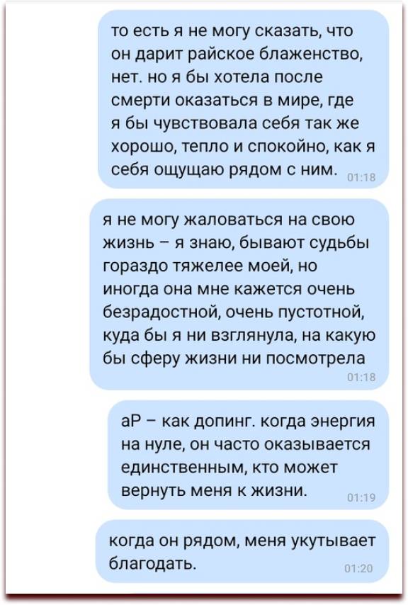 Аня и аР продолжают встречаться. Дружба аР и программистки постепенно утихла до лайков в соцсетях, а потом и вовсе сошла на нет. Она смотрела на фото аР в соцсетях и недоумевала: "Неужели это было правдой? Нас когда-то что-то сильно связывало? Неужели между мной и ним была какая-то связь? Кто он? Я будто его не знаю". Она долго, с усилием вглядывалась в черты когда-то знакомого лица и складки одежды. Всё пыталась понять, разобраться, как и почему это случилось, почему так произошло – а потом её резко и оглушительно настигало внутреннее понимание: "Не моё". Не моё. Будто это произносит за тебя кто-то другой. Два слова – два хлопка до глухоты чувств – захлопнуть ноутбук – глаза – спать. И в тёмной пустоте комнаты звенят заевшие три слога пяти букв: не моё. В какой-то момент она сумела убедить себя, что его и вовсе не существует. Убедила себя, что настолько умна, что вся история их странной дружбы – как и сам аР – были лишь плодом её воображения. И стылая, жадная тьма-тоска в левой части груди – это фантом, выдумка, рудимент фантазии. А если она кого-то придумала, значит, этого кого-то так же легко удалить из памяти.