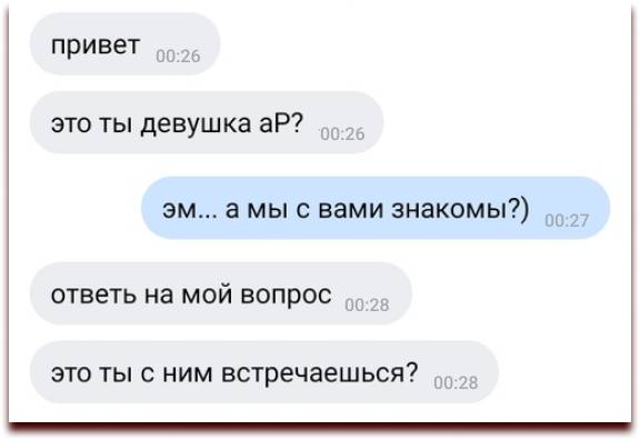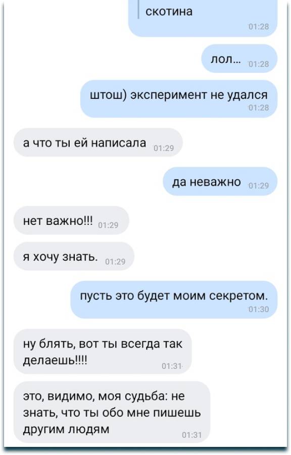 Ещё одна девушка, которая пишет об аР, (мини-спойлер: её зовут Лиза) беззаветно и безответно в него влюблена. Они учатся вместе, но аР о чувствах Лизы даже не подозревает. Лиза сталкерит аР по ночам и выплёскивает эмоции в стихи. Однажды ночью она с ужасом обнаруживает на страничке аР статус «влюблён». С немым криком «Проиграла!» она идёт в ванную и режет до мяса свои ноги, наказывая себя за то, что возлюбленный влюбился не в неё. Порезы временно помогают ей успокоиться, но не избавляют от душевных терзаний, и спустя какое-то время Лиза в час ночи пишет лучшей подруге аР (той самой программистке), потому что думает, что аР встречается именно с ней. Сначала программистка отвечает Лизе ради забавы и пробует выяснить, кто же пытается разузнать про её друга. Когда же Лиза задаёт вопрос «Каково это, любить его?», программистка, посоветовавшись с аР, решает следовать чужим правилам игры. Она отправляет незнакомой девушке огромные сообщения, искренне описывая то, что чувствует к лучшему другу – и получает в ответ «скотина». Лиза думает, что читает мысли девушки, с которой аР засыпает и просыпается, и от этого по её внутренностям в очередной раз проносится кипяток. От прочитанных сообщений ей становится только хуже. Когда же аР спрашивает у лучшей подруги, что она ответила неведомой сталкерше, программистка отшучивается, мол, всё это неважно.