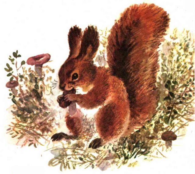 В лесу на высокой сосне свила белка гнездо. Всё круглое, закрытое, а с одной стороны лазейка оставлена, чтобы внутрь можно было забраться. Белка — зверёк ловкий. Весь день с сучка на сучок, с дерева на дерево прыгает — где ягоду сорвёт, где еловую шишку. А наступит осень — тут белка на зиму запасы примется готовить. То грибы повесит сушиться, то орехи в дупло запрячет. Холодно, голодно зимой, вот и пригодятся белке припасы.