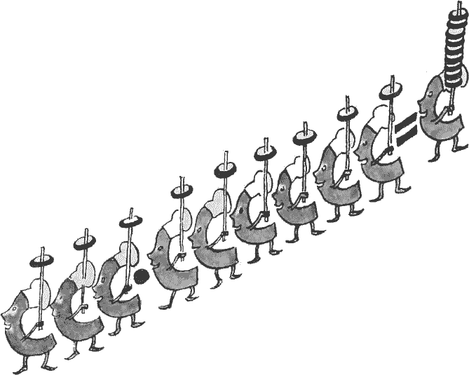 Да, Нулик, вот мы и у цели. Эф привела нас на то самое место, где вырос и тут же разрушился воздушный замок. Помнишь, он нам ещё так понравился? — Теперь, — сказала Эф, — пора вам составлять уравнения. Подходите к любому Составителю. Каждый научит вас чему-нибудь новому. Здесь составляются уравнения на все случаи жизни. Ну и дела! Без уравнений теперь «и ни туды и ни сюды». Задумал построить мост — составляй уравнения, хочешь запустить космический корабль — составляй уравнения. И для атомного реактора, и для нефтяной скважины, и даже для того, чтобы сшить на фабрике ботинки, — для всего нужно сперва составить уравнения, решить их и только тогда приступать к делу. Это уж точно. Мы тут наблюдали за многими Составителями. Чтобы написать про всех, надо гору бумаги. Поэтому я расскажу тебе о двух-трёх. На первый раз хватит. Кроме Составителей, на этом строительстве много практикантов вроде нас. Они тоже ещё только учатся и потому часто попадают впросак. Но Составители на них не сердятся, а терпеливо разъясняют ошибки. Один практикант строил стену из кирпичей. Положит несколько рядов, рассыплет и опять начнёт. Мы слышали, как он сам с собой разговаривал: — Так и через десять лет не построишь! Ну и задачка! — Что это вы делаете? — спросила Таня. — Стену строю, — вздохнул тот, — да вот ничего не получается. — Наверное, потому, что вы не кладёте цемента, — догадался Сева. — Нет, цемент тут ни при чём. Он протянул нам листок, где была написана такая задача: