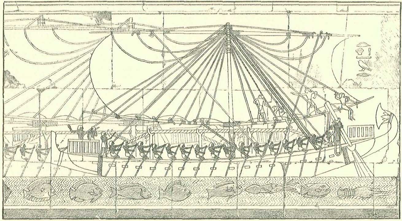 ⠀⠀ ⠀⠀ ⠀⠀ ⠀⠀ Возможности эти, бесспорно, были значительными и приведены здесь лишь в общих чертах. И все-таки остаются вопросы относительно сообщения Геродота. Несмотря на то, что оно содержит крайне скупые сведения, тем не менее сомнительно, что «так впервые было доказано, что Ливия окружена морем». Мы еще узнаем, как целеустремленно египетские правители посылали своих людей на исследование Африки не ради славы или ни к чему не обязывающей жажды знаний, а в поисках сырья, золота и других ценностей. Поэтому представляется сомнительным, что предприятие, затеянное по повелению Нехо II, до того не имело аналогов. Скорее всего, оно такое же «единственное в своем роде», как и упомянутая Геродотом попытка соединить Нил каналом с Красным морем. Осуществление подобного намерения было начато уже во времена Среднего царства (ок. 2040–1730 гг. до н. э.). Следовательно, и в этом случае Нехо заимствовал идею у древних, пожертвовав ради нее жизнью ста двадцати тысяч человек. ⠀⠀ ⠀⠀ ⠀⠀ ⠀⠀ Египетское морское судно с опущенной мачтой. Рельеф на гробнице фараона Сахура в Абу-Сире (XXVI в. до н. э.)
