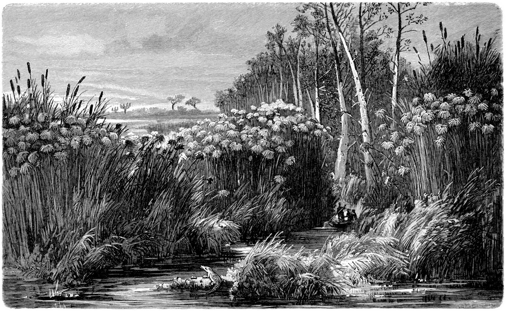 ⠀⠀ ⠀⠀ ⠀⠀ ⠀⠀ В нижнем течении Нигера, после впадения в него реки Бенуэ, так неспешно текущей из центральных районов континента, возникают опасные мели. Наконец воды Нигера, с трудом достигнув дельты, исчезают в ней, этом рассаднике бесчисленных полчищ паразитов-кровососов. Примерно то же самое наблюдается вдоль русла Сенегала. Его поначалу быстрому течению препятствуют водопады и пороги. Но полупустыня поглощает такое количество воды, что река месяцами не достигала бы берега моря, если бы не атлантический прибой, поднимающимся навстречу течению и проникающий на сотни километров в глубь суши. В Центральном Судане река Лотоне и один из ее притоков, а также река Бенуэ связывают Гвинейский залив с бассейном озера Чад. В то же время по реке Шари можно попасть из бассейна озера Чад в бассейн Конго. Оба этих водных пути сыграли огромную роль в открытии и изучении региона озера Чад. Непосредственного соединения с бассейном Нила теперь не существует. Там, в верховьях Белого Нила, возникла самая большая в Африке область болот, названная Сэдд, — неимоверная путаница обильно разросшихся водяных растений, препятствовавшая всякому судоходству вплоть до начала нашего столетия. Ненамного благоприятнее для судоходства и морское побережье Судана. За исключением отдельных заводей и лагун, берег представляет собой довольно плавную линию и совершенно не защищен от могучего прибоя.Растительность в районе верхнего Нила. Особую экзотику местности придают заросли папируса, стебли которого достигают шестиметровой высоты и заканчиваются своеобразными розетками из листьев.