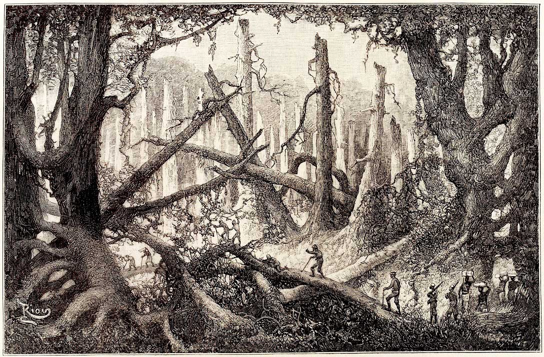 Правда, влажный тропический лес, раскинувшийся перед ним, вряд ли можно было преодолеть лишь при помощи денег и наемников. Лежавшие на земле стволы деревьев и ветки преграждали путь, опавшая листва скрывала вязкую трясину. То и дело поскальзываясь, мучимые муравьями и другими насекомыми, люди тащились вперед в одежде, мокрой от пота и капавшей отовсюду влаги. Кругом стоял запах гнили, во мраке под деревьями-гигантами, достигавшими тридцатиметровой высоты, лишь изредка мог сверкнуть цветок или раздаться крик какой-нибудь птицы, иногда слышалось сопение бегемота в реке. 19 ноября экспедиция перебралась с правого берега на левый. Стэнли, Фрэнсис Покок (последний из трех английских попутчиков, оставшийся в живых), Типпо-Тип и тридцать гребцов продолжали путь на «Леди Элис», остальные шли по берегу, повторяя изгибы реки. Постоянно возникали столкновения. Местные жители хорошо знали по голосам подручных Типпо-Типа, охотников за рабами, и уже поэтому оказывали ожесточенное сопротивление. После одной из очередных кровавых побед Стэнли захватил двадцать три большие лодки. ⠀⠀ ⠀⠀ ⠀⠀ ⠀⠀