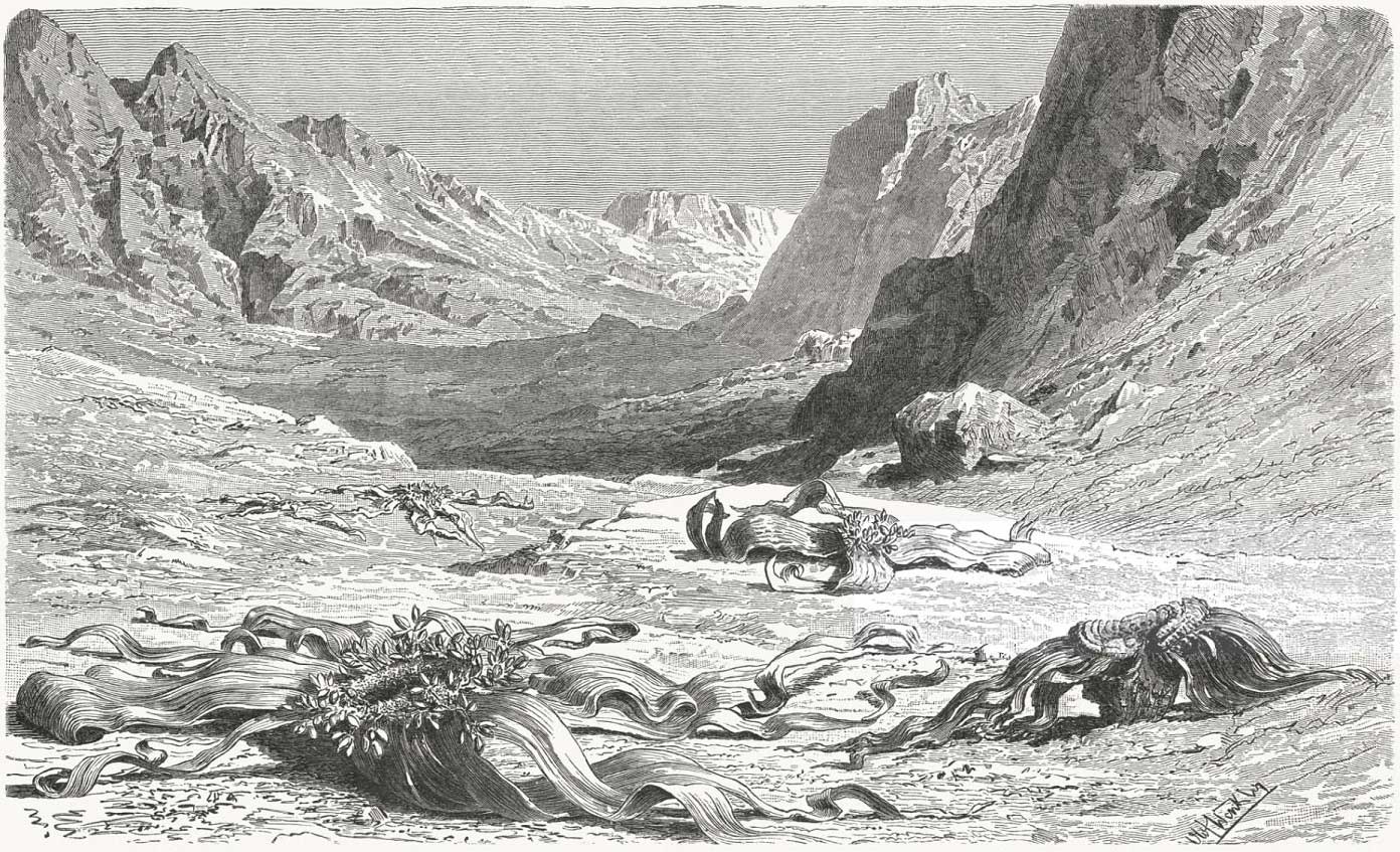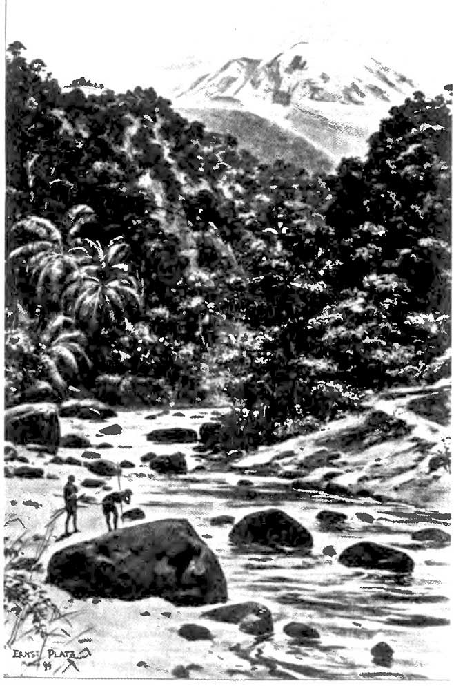 ⠀⠀ ⠀⠀ ⠀⠀ ⠀⠀ Даже гениальный Александр Гумбольдт, поднявшийся почти до самого нижнего края ледника на вершине Чимборасо, тоже находящейся около экватора, выражал сомнение. Дискуссия была в самом разгаре, когда посланники веры вновь заставили заговорить о себе. Якоб Эрхардт, семь лет проработавший вместе с Крапфом и Ребманном, опубликовал в 1856 году в Лондоне карту Центральной Африки, на которой было изображено гигантское внутреннее море Уньямвези, охватывавшее по широте почти четырнадцать градусов. ⠀⠀ ⠀⠀ ⠀⠀ ⠀⠀ Вид на вершину Кибо