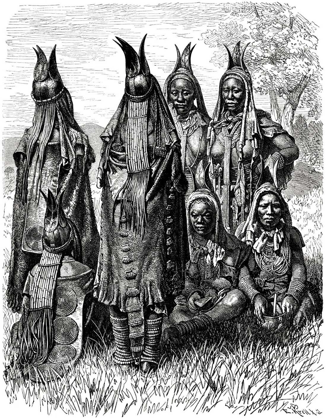 ⠀⠀ ⠀⠀ ⠀⠀ ⠀⠀ ⠀⠀⠀⠀ ⠀⠀ ⠀⠀ в пределах Ботсваны и все еще занята собирательством и охотой, часть — расселилась в Намибии и южной Анголе. С тех пор как они были вытеснены в эти районы, добыча пропитания стала для них очень сложной. Они часами и даже днями вынуждены были выслеживать редкую дичь, но чаще вся их еда состояла из луковичных корнеплодов. Родственные бушменам кочевники-скотоводы готтентоты к началу европейской колонизации населяли Капскую область. Они были искусными охотниками, разводили крупный рогатый скот и овец, были знакомы с обработкой металла, но земледелием не занимались. После того как их согнали с исконных земель, они поселились в полосе сухих степей и саванн, протянувшейся от юго-запада ЮАР через Намибию до юга Анголы. К негроидам и представителям народов, говорящих на языках банту, относятся гереро — в прошлом кочевой народ, занимающийся скотоводством на западе Ботсваны и северо-востоке Намибии. Соседняя с ними Ангола, напротив, заселена этническими группами, занимающимися в основном земледелием в сухих лесах и саваннах. ⠀⠀ ⠀⠀ ⠀⠀ ⠀⠀ Женщины-гереро в традиционных головных уборах и разукрашенных накидках из шкур крупного рогатого скота.