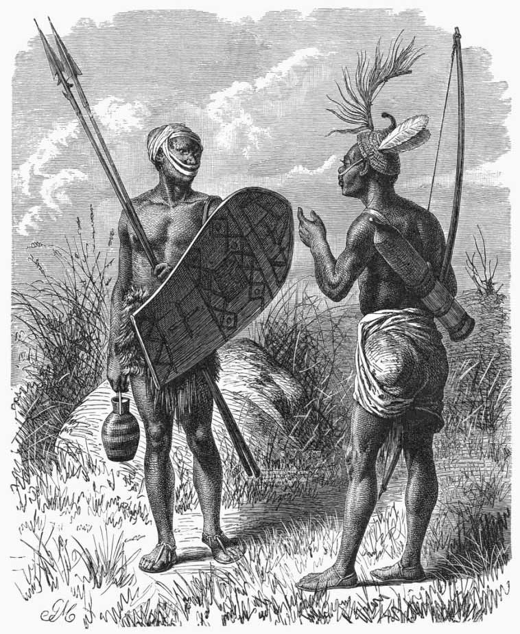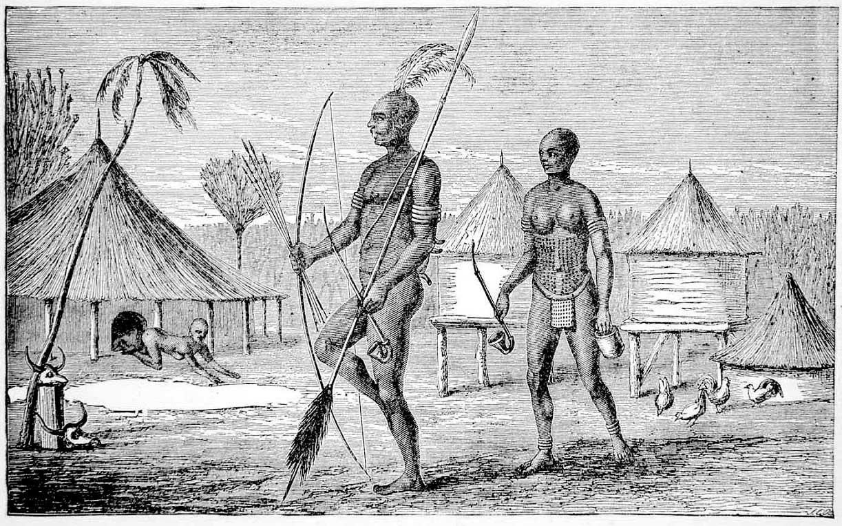 ⠀⠀ ⠀⠀ ⠀⠀ ⠀⠀ У бонго ученый нашел самобытные проявления искусства: вырезанные из дерева фигуры в натуральную величину выходят, словно процессия, из могилы вождя. Они изображают вождя и членов его семьи, в наивной манере подчеркивая их индивидуальные черты и половые признаки. Кроме того, вырезанные изображения украшены жемчужными ожерельями и оклеены волосами, чтобы своим обликом больше походить на умерших. Швейнфурту понравились пение бонго и их явно выраженная музыкальность, хотя его чуткий слух привык к более нежным звукам. «Могучие удары булав по натянутой коже гигантского барабана производят звуки, изображающие удар грома, от которого трескается дуб. Резкое завывание бури, шум и свист дождя под порывами ветра — все это способен передать только стоголосый хор с сильными глотками. Вой напуганного дикого зверя передается звучанием трубы, щебечущие голоса птиц — свистом и звуками флейт…» 219 В январе 1870 года экспедиция достигла района расселения народа азанде (ньям-ньям)220. Люди, вышедшие навстречу путешественнику, производили очень странное, даже дикое впечатление: воины в угрожающей позе, в одной руке копье, в другой щит и сабля причудливой формы, бедра обмотаны шкурами длинношерстных обезьян; волосы заплетены в длинные косы, лоб и грудь украшены нанизанными на шнурки зубами убитых врагов, что подтверждало дурную репутацию представителей этого народа. Кроме того, Швейнфурт заметил несомненные признаки каннибализма и подробно описал все, что ему об этом стало известно. Он назвал каннибализм отвратительным явлением, но воздержался от неуместных оценок. Тем не менее он охарактеризовал азанде как необыкновенно отважных охотников, искусных кузнецов, гончаров и резчиков по дереву, а также как страстных певцов и любителей развлечений. Только позже, «в один из немногих несчастных дней» путешествия, он увидел на своем пути початки кукурузы, куриные перья и стрелу — грозное объявление войны. Если кто-нибудь осмелится разломить хотя бы один початок или украсть курицу, будет немедленно убит стрелой. Исследователь и его спутники выполнили требование, но на них все равно напали, и они вынуждены были применить оружие. Учитывая размах работорговли и межплеменные раздоры, удивительно, что подобные вещи происходили нечасто. ⠀⠀ ⠀⠀ ⠀⠀ ⠀⠀233