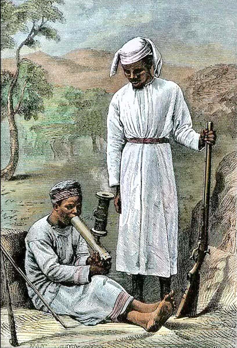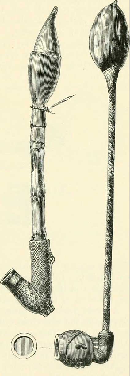 ⠀⠀ ⠀⠀ ⠀⠀ ⠀⠀ Спик считал, что цель экспедиции достигнута: «Я видел, что старый отец-Нил, вне всякого сомнения, начинается в Виктории-Ньянзе, и это озеро, как я и предсказывал, является великим истоком священной реки». Такая категоричность удивляет. Ведь он не проводил тщательных исследований озера ни по воде, ни по суше. Каковы, собственно, доказательства того, что его открытия 1858 года и водопад Рипон относятся к одному и тому же озеру? Почему река, вытекающая из него, обязательно Нил? Разумеется, эти вопросы мучали Спика, и он сделал попытку спуститься вниз по реке, но это ему не удалось. Он возвратился в тогдашнюю столицу государства Уньоро215, вновь встретился с Грантом, и до ноября 1862 года оба находились при дворе правителя Камраси. Путешественники познакомились с другим общественным укладом, основу которого составляло преимущественно скотоводство. Некоторые особенности, например кочевой образ жизни, препятствовавший образованию в стране крупных поселений, повлияли на то, что по сравнению с Бугандой в их суждениях проскальзывало порой пренебрежение. Тем не менее государство Уньоро показалось британцам достаточно основательным, чтобы рекомендовать его в качестве торгового партнера, а также для организации миссионерской деятельности. ⠀⠀ ⠀⠀ ⠀⠀ ⠀⠀ Трубки для курения табака из района верхнего Нила. Для охлаждения дыма мундштуки трубок делали из бутылочных тыкв