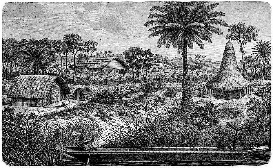 ⠀⠀ ⠀⠀ ⠀⠀ ⠀⠀ Поскольку на них он мог перевести всю свою экспедицию, насчитывавшую теперь около ста пятидесяти человек, он довольно спокойно отнесся к тому, что Типпо-Тип решительно отказался сопровождать его дальше. Расстались они 27 декабря 1876 года неподалеку от населенного пункта Винья-Ньяра, расположенного примерно на 2°30′ южной широты. Река достигала уже 1600–1800 метров ширины, ее берега и острова поросли густым лесом. В путевых заметках Стэнли, постепенно все больше и больше походивших на военный дневник, сообщается о жителях, живших в поселках, защищенных рвами и оградами. Их хижины, сплетенные из растений, имели как круглые, так и остроконечные крыши. Питание жителей составляли маниока и бананы, а также то, что удавалось добыть путем рыбной ловли и охоты. Особенно высоко ценилась соль, которую племена на Конго получали, сжигая в специальных печах определенную траву. Так как маниоку можно выращивать только в течение трех лет, а затем почва полностью истощается, приходилось постоянно отвоевывать у леса новые посевные площади. Делалось это так. Подлесок вырубали и, когда он засыхал, сжигали, большие же деревья не трогали. Эту работу выполняли мужчины; посев, уход за растениями и сбор урожая составляли заботу женщин. Как мужчины, так и женщины носили фартуки из аккуратно сплетенных пальмовых волокон. ⠀⠀ ⠀⠀ ⠀⠀ ⠀⠀ Стенли на реке Конго