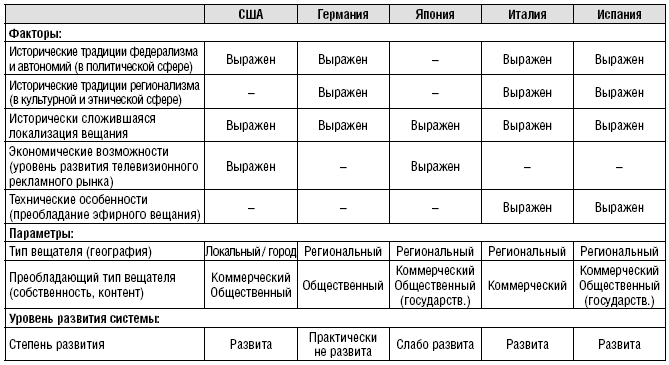 Предпринятый выше экскурс в зарубежный опыт, обобщенный в таблице, показывает, что даже если государство в своей политике и медиаполитике стремится к предельной централизации, предпосылок для естественного формирования сильного регионального телевидения в России достаточно. У нас в разные исторические периоды накоплен значительный опыт федерализма, очевидно огромное этнокультурное разнообразие, сильны другие факторы локализации, а государство и частные инвесторы готовы к созданию и поддержке медиапроектов. И система регионального телевидения у нас создана, хотя и с рядом специфических проблемных зон, обусловленных особенностями отечественной медиаэкономики.