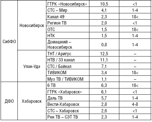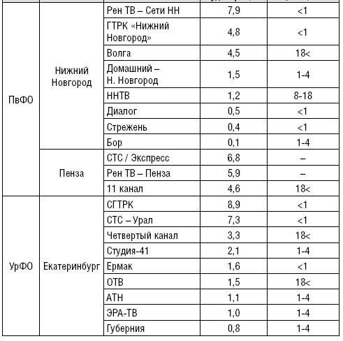 Региональные полновещательные телеканалы уступают филиалам ВГТРК и партнерам коммерческих федеральных телесетей по доле аудитории на местных рынках. Следует оговориться, что выпуски новостей этих телеканалов вполне способны бороться за лидерство по интересу местной аудитории с любыми конкурентами, однако суточный эфир в целом редко позволяет иметь долю выше 3–4 % по основному городу вещания. В табл. 10 представлены наиболее высокие показатели локальных полновещательных каналов по доле аудитории на местных рынках в тех городах, где проводились соответствующие исследования TNS.