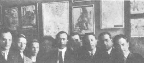 На снимке вверху; авторы этой книжки среди друзей-крокодильцев. Крайний справа — Б. Е. Ефимов, крайний слева — И. П. Абрамский. 1932 г.А. ВИХРЕВ