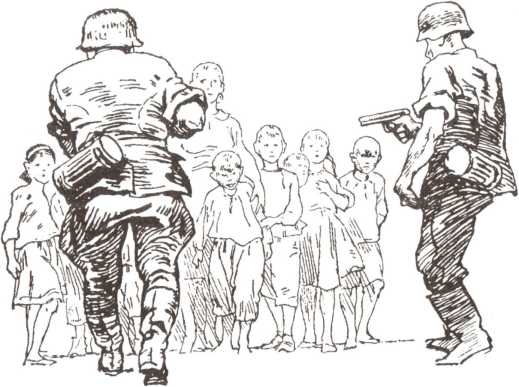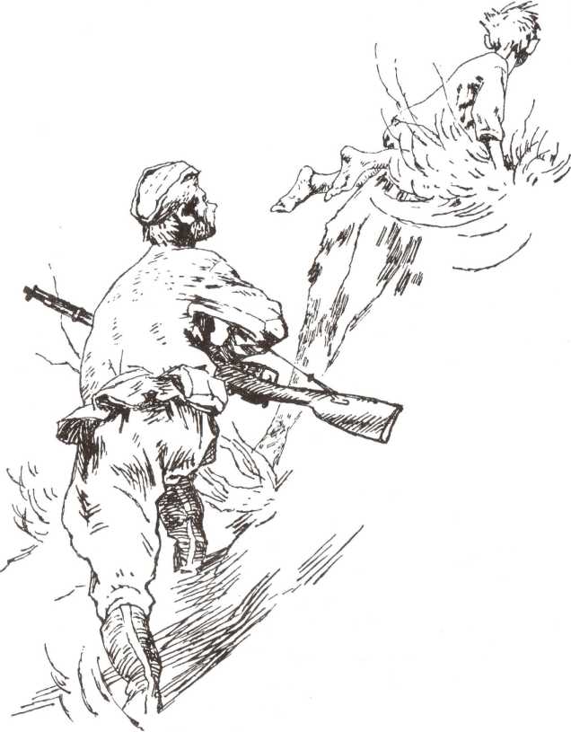 «Ты что тут?» — говорю я. «Я, — говорит, — корову ищу. Вы не видели, дядя? Маришкой зовут. Сама белая, а на боке черное. Один рог вниз торчит, а другого вовсе нет… Только вы, дядя, не верьте… это я все вру… пробую так. Дядя, — говорит, — вы от наших отбились?» «А это кто такие — ваши?» — спрашиваю. «Ясно кто — Красная армия… Только наши вчера за реку ушли. А вы, дядя, зачем тут? Вас немцы зацапают». «А ну, иди сюда, — говорю. — Расскажи, что тут в твоей местности делается». Голова исчезла, опять появилась нога, а ко мне по глиняному склону на дно оврага, как на салазках, пятками вперед, съехал мальчонка лет тринадцати. «Дядя, — зашептал он, — вы скорее отсюда давайте куда-нибудь. Тут немцы. У них вон у того леса четыре пушки стоят, а здесь сбоку минометы ихние установлены. Тут через дорогу никакого ходу нет». «И откуда, — говорю, — ты все это знаешь?» «Как, — говорит, — откуда? Даром, что ли, с утра наблюдаю?» «Для чего же наблюдаешь?» «Пригодится в жизни, мало ль что…» Стал я его расспрашивать, и малец рассказал мне про всю обстановку. Выяснил я, что овраг идет по лесу далеко и по дну его можно будет вывести наших из зоны огня. Мальчишка вызвался проводить нас. Только мы стали выбираться из оврага, в лес, как вдруг засвистело в воздухе, завыло и раздался такой треск, словно вокруг половину деревьевразом на тысячи сухих щепок раскололо. Это немецкая мина угодила прямо в овраг и рванула землю около нас. Темно стало у меня в глазах. Потом я высвободил голову из-под насыпавшейся на меня земли, огляделся: где, думаю, мой маленький товарищ? Вижу, медленно приподымает он свою кудлатую голову от земли, начинает выковыривать пальцем глину из ушей, изо рта, из носа. «Вот это так дало! — говорит. — Попало нам, дядя, с вами, как богатым… Ой, дядя, — говорит, — погодите! Да вы ж раненый». Хотел я подняться, а ног не чую. И вижу — из разорванного сапога кровь плывет. А мальчишка вдруг прислушался, вскарабкался к кустам, выглянул на дорогу, скатился опять вниз и шепчет: «Дядя, — говорит, — сюда немцы идут. Офицер впереди. Честное слово! Давайте скорее отсюда. Эх ты, как вас сильно!..» Попробовал я шевельнуться, а к ногам словно по десять пудов к каждой привязано. Не вылезти мне из оврага. Тянет меня вниз, назад… «Эх, дядя, дядя!.. — говорит мой дружок и сам чуть не плачет. — Ну, тогда лежите здесь, дядя, чтоб вас не слыхать, не видать. А я им сейчас глаза отведу, а потом вернусь, после…» Побледнел он так, что веснушек еще больше стало, а глаза у самого блестят. «Что он такое задумал?» — соображаю я. Хотел было его удержать, схватил за пятку, да куда там! Только мелькнули над моей головой его ноги с растопыренными чумазыми пальцами — на мизинчике синяя тряпочка, как сейчас вижу… Лежу я и прислушиваюсь. Вдруг слышу: «Стой!.. Стоять! Не ходить дальше!» Заскрипели над моей головой тяжелые сапоги, я расслышал, как немец спросил: «Ты что такое тут делал?» «Я, дяденька, корову ищу, — донесся до меня голос моего дружка, — хорошая такая корова, сама белая, а на боке черное, один рог вниз торчит, а другого вовсе нет. Маришкой зовут. Вы не видели?» «Какая такая корова? Ты, я вижу, хочешь болтать мне глупости. Иди сюда близко. Ты что такое лазал тут уж очень долго, я тебя видел, как ты лазал». «Дяденька, я корову ищу…» — стал опять плаксиво тянуть мой мальчонка. И внезапно по дороге четко застучали его легкие босы