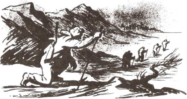 Разведчики уже не отстреливались. Теперь их могли спасти только легкие ноги, лыжи, потемки да разве еще солдатское счастье. Этого счастья хватило на четверых. Пятому же с самого начала не повезло, и этот пятый был самый молодой и неопытный — Ваня Потапов. Начались Ванины злоключения с того, что, надевая лыжи, он обронил одну палку. Нужно было плюнуть и бежать, а он побоялся плюнуть, скинул лыжи и полез за палкой вниз. Ушло на это каких-нибудь полминуты, но за эти полминуты Потапов отстал от товарищей, а немцы подошли ближе. И наверно, они видели его теперь, потому что, когда он опять стал на лыжи, пули жужжали над его головой, как пчелы. Чокаясь о камень, они выбивали искры. И вот он услышал, как одна из них ударилась уже не о камень, а ударила его в плечо. Боли Ваня почти не почувствовал, но его так сильно тряхнуло, что палка — та самая, которую он только что потерял и нашел, — выскочила из руки и отлетела в сторону. На этот раз он не стал искать ее, не оглянулся даже, а поменял руку и с одной палкой побежал дальше. На его счастье, путь шел теперь под гору, под ногами был снег. А по снегу да еще с горы идти было куда легче. Потом он увидел товарищей. Они бежали гуськом — уже далеко внизу, там, где кончались скалы и начиналась ровная открытая тундра. Последним шел кто-то очень высокий, в полтора человеческих роста, и Ваня не сразу сообразил, что это ефрейтор Андронников, у которого на плечах пленный немец. А за спиной все еще цокали выстрелы, и все еще слышно было, как свистят пули, хотя в ушах у Вани и без того свистело… Согнув в коленях ноги и прижимая локтями палку и автомат, он вихрем катился вниз, его подкидывало, в лицо ему стегали ветер и колючая снежная пыль, а он ничего не чувствовал, кроме радости от этой бешеной гонки и от сознания, что он жив, и товарищи его живы, и товарищи его уже близко, а немцы далеко. Но вот он скатился на ровное место и вдруг почувствовал, что ноги его уже не идут и руки не держат палку. В висках у него застучало, в глазах помутилось, и сладкая тошнотворная слабость разлилась по всему телу. Еще минута — и он свалился бы в снег. Но тут показалось ему, что за спиной его опять слышатся выстрелы и даже голоса людей. На один миг он представил себе, как его хватают, связывают ремнем и тащат, как тащит сейчас Андронников этого немца. «Нет… к черту… уйду», — сказал себе Ваня. И, пересилив себя, поборов слабость, пошел, задвигал ногами, замахал палкой. А за это время товарищи его опять ушли далеко. Но все-таки он видел их, и это радовало его, подхлестывало, придавало сил. Шел он медленно, даже не шел, а брел черепашьим шагом, а ему казалось, что он бежит, потому что с каждым шагом расстояние между ним и товарищами уменьшалось. А дело было в том, что товарищи его вовсе не шли, а стояли, ждали его. Пробежав километра три по тундре, они обнаружили исчезновение Потапова, расстроились, решили уже, что он погиб. Но тут Костюков, который нес теперь связанного «языка», увидел Ваню. Хоть и рады были разведчики, что Ваня живой, а все-таки первым делом принялись ругать его и смеяться над ним. — Ты что — в разведке находишься или в деревне гуляешь? — еще издали крикнул ему Андронников. Ваня попробовал ухмыльнуться, но даже улыбка у него не получилась. Прихрамывая и по-стариковски опираясь на палку, он с трудом тащил свое тело, ставшее таким тяжелым и неуклюжим. — Куд