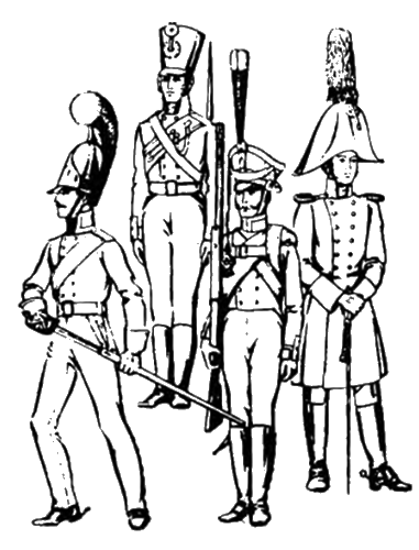 Слева направо: унтер-офицер драгунского полка (1803); канонир (1803); унтер-офицер гренадерского полка (1812); обер-офицер кавалерии
