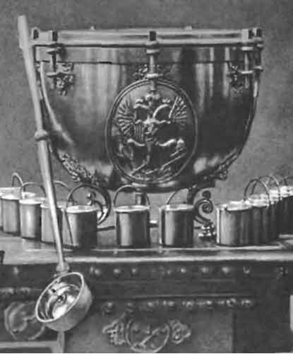 А теперь нам предстоит заглянуть на полковую кухню, приподнять крышку артельного котла, чтобы узнать, что варилось в нем в столь далекое от нас время. Для начала вкратце ознакомимся с провиантскими проблемами допетровского периода — яснее представим суть реформ эпохи «регулярства». В России XVII века важнейшей повинностью населения являлась хлебная подать, шедшая на удовлетворение потребностей русского войска в провианте. А потребности эти были очень велики — до 10 миллионов пудов зерна собирали для этой цели ежегодно! Хлеб вначале свозили в государевы житницы, и различался он как стрелецкий (по одной статье сборов), то есть предназначавшийся стрельцам, и тот, что шел на содержание полков нового строя, солдатских, рейтарских и копейных. Потом, уже в виде хлебного жалованья, зерно выдавалось всем ратным людям, продавалось или предлагалось взаимообразно. Хлебное жалованье по размеру было чрезвычайно разнообразным. Пушкари, к примеру, имели хлеб от 22 до 8 четвертей в год (в четверти — 7 пудов 10 фунтов[8] — 116 килограммов), и норма эта зависела от чина, от «старости» службы, от занимаемой должности и даже от того, в каком городе служил воин. В Переяславле, например, пушкари имели вообще всего 6 четвертей хлеба в год. А иногда выдача хлеба заменялась денежной компенсацией, и случалось это в неурожайные годы, когда не удавалось заполнить государственные житницы. Бесплатной была еще и соль. Особенно заботилось правительство о тщательной, полноценной заготовке продуктов питания в военное время, в период проведения походов — заранее составлялись росписи-сметы на необходимые в кампаниях виды продовольствия. В 1695 году, перед первым Азовским походом, когда действовали еще характерные для XVII века приемы довольствия армии, заготовлением продуктов для армии молодого Петра занялись «московские гости» Воронин, Горязин и Ушаков, собравшие в городе Паншине значительные запасы провианта. Сюда было свезено 15 тысяч ведер сбитня, 45 тысяч ведер уксуса, 45 тысяч ведер вина, 20 тысяч штук осетров соленых, 10 тысяч штук щук и судаков, 10 тысяч штук лещей, 8 тысяч пудов соли. Подвезли чуть позже еще 120 тысяч штук «всякой рыбы, да снятков псковских, новгородских послано с гостем Березиным 543 чети», то есть четверти. Чтобы заготовить такие огромные запасы, из Приказа Большой казны выдали подрядчикам вперед более 33 тысяч рублей. Но одной лишь рыбой, сбитнем и вином питаться воины, конечно, не могли, поэтому в походе им выдавали еще и овсяную крупу, крупу ржаную, толокно, сухари. Этот провиант выдавался им на руки в две недели раз, и если нести его с собой, в мешке, было тяжело и неудобно, то припасы перевозились на подводах, нанятых за счет солдатских денег или полковой казны. Начало Северной войны, переход в комплектовании армии к рекрутским наборам, когда армию пополняли очень молодые, часто неготовые к новой, жесткой обстановке люди, потребовали от правительства Петра искать способы к пропитанию новобранцев, еще практически не влившихся в войско и не поставленных, как сказали бы сейчас, на довольствие. Вот поэтому и обязали помещиков — бывших владельцев теперешних рекрутов снабдить в дорогу новобранцев всем необходимым: одеждой и, главное, провизией. И потянулись телеги с молодыми мужиками, убитыми горем в предчувствии будущих невзгод. На некоторых возах — их жены 