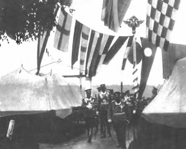 Император Николай II, великий князь Николай Николаевич в сопровождении свиты и командира лейб-гвардии Преображенского полка князя Оболенского осматривают лагерь в Красном Селе (1913)