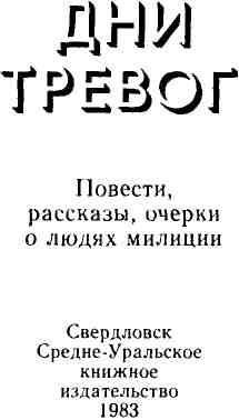Советская милиция была создана на третий день после победы пролетарской революции в России. Новое государство, государство рабочих и крестьян, с его новой политической системой, нужно было защищать и укреплять. В те дни в ряды милиции пришли участники Октября, люди с огромным зарядом революционной энергии, с чувством высокой ответственности за порученное дело. Одним из боевых отрядов советской милиции является милиция Среднего Урала. Вместе со всей страной милиция нашей области развивалась и совершенствовалась в огне гражданской войны, в борьбе с разрухой, в период социалистического строительства, в суровые годы Великой Отечественной войны и в напряженные послевоенные годы. На всех этапах революционной борьбы и труда она выполняла ответственные задачи по укреплению социалистического правопорядка. В областном Музее истории милиции есть примечательный экспонат — фотография партийного билета первого начальника Екатеринбургской губернской милиции Петра Григорьевича Савотина. Сподвижником и соратником его был Савватей Архипович Борхаленко, командир 47-й милицейской бригады, разгромившей крупные банды в Ирбитском уезде. Из двадцатых годов дошли до нас имена Николая Михайловича Вотинова — начальника 8-го района милиции Нижнетагильского округа; Евгения Ивановича Рудакова, начальника милиции 3-го района Алапаевского уезда. Его имя стоит первым на мемориальной доске, установленной в областном Управлении внутренних дел в память о погибших на боевом посту. В период индустриализации и коллективизации сельского хозяйства в области сыщиком номер один назван Александр Иванович Кандазали, который раскрыл в то время немало сложных, запутанных преступлений. Многие названные и не названные поименно солдаты правопорядка свердловской милиции пронесли сквозь годы свое высокое назначение. Их имена составляют честь и славу милиции всей страны. Милиция наших дней развивает лучшие традиции, созданные предыдущими ее поколениями. В современных условиях главные свои усилия солдаты правопорядка направляют на предупреждение правонарушений, на то, чтобы никто не мог безнаказанно посягать на интересы государства и личности. Развернутая программа деятельности милиции определена в решениях XXVI съезда партии, в постановлении ЦК КПСС от 2 августа 1979 года «Об улучшении работы по охране правопорядка и усилении борьбы с правонарушениями». Совершенствуется ныне структура милицейских подразделений и служб. Обнаружить следы преступника, разыскать и изобличить его инспектору уголовного розыска и следователю помогают теперь электронно-вычислительная техника и кинофотосъемки, магнитофонная запись и тончайшие методы физико-химического анализа. Служба охраны общественного порядка оснащена современным транспортом, средствами связи. Все это помогает органам милиции быстрее реагировать на заявления и сообщения граждан о происшествиях, вовремя предупреждать, пресекать преступления, раскрывать их по горячим следам. Во всей своей деятельности милиция опирается на помощь и поддержку населения, трудовых коллективов. Многогранна деятельность милиции: борьба с детской безнадзорностью, работа ОБХСС, уголовный розыск, служба ГАИ… Об этом многообразии и рассказывают в сборнике «Дни тревог» писатели и журналисты. На страницах книги лицом к л