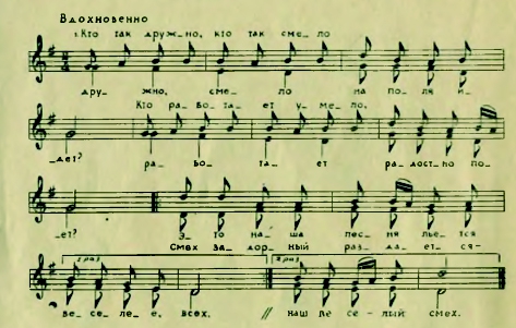 1. Кто так дружно, кто так смело На поля идёт? Кто работает умело, Радостно поёт?! Это наша песня льётся Веселее всех. Смех задорный раздаётся — Наш весёлый смех!