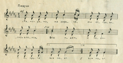 1. Рано-рано, На зорьке, Мы отправились в поход. {Все идём И поём — И округа вся поёт.} - 2 раза 2. Кличут горны За Волгу: Там и речка, там и пляж. {Всех нас ждёт Целый год Пионерский лагерь наш.} - 2 раза