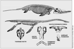 Скелеты найденных Мэри Эннинг ихтиозавра (вверху) и плезиозавра с фрагментами отдельных костей (внизу).