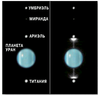 Планета Уран с кольцами и спутниками. Фото НАСА.