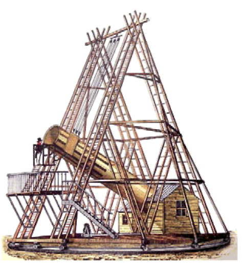 Самый большой (12-метровый в длину) телескоп, построенный Гершелем. Сотрудники, помогавшие астроному, называли наблюдения на этом телескопе «бритьём с помощью гильотины». Старинная гравюра.
