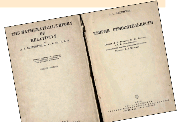 Знаменитая книга Эддингтона о теории относительности Эйнштейна была переведена на многие языки. На русском языке издавалась в 1 934 году. Фото книги из личной коллекции автора.
