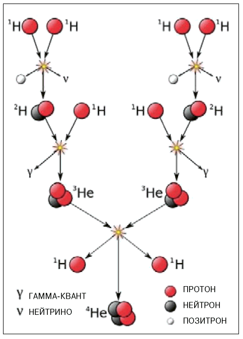 Протон-протонный цикл — одна из термоядерных реакций в звёздах: из водорода образуется дейтерий, потом нестабильный изотоп гелий-3 и в конце концов очень устойчивый изотоп гелий-4. Образовавшиеся нейтрино быстро покидают звезду, а гамма-кванты начинают медленное движение к поверхности. В ходе своего многолетнего путешествия к поверхности Солнца жёсткие гамма-кванты переизлучаются столько раз, что к моменту вылета из фотосферы они становятся вполне приятным мягким солнечным светом.