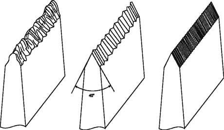 Вот так выглядит увеличенно лезвие тупого ножа (1), ножа с правильно выпрофилированным режущим клином (2) и законченное лезвие хорошо заточенного ножа (3)
