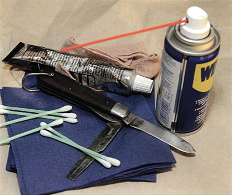 Когда начинать ухаживать за новым ножом? Как ни парадоксально — сразу после его покупки. Отправляя свое изделие в торговую сеть, производитель меньше всего хочет получить его назад по причине повреждения при перевозке или хранении. Для чего заблаговременно предпринимает меры — производит консервацию ножа. Для консервационных смазок (как правило, это технические вазелины и разнообразные предохранительные составы) наиболее важным свойством является их способность защищать находящуюся под ними поверхность от неблагоприятных факторов. Эти свойства определяются их способностью удерживаться на защищаемых поверхностях при механических воздействиях, смываться водой, а также сроком службы. Так что даже если нож куплен в коллекцию без прицела на его практическое использование, то рано или поздно все равно придется заменить старую, частично полимеризовавшуюся, консервационную смазку новой. Если консервационную смазку оставить в шарнире активно используемого ножа или мультитула, то его владельца вскоре ожидают малоприятные вещи. Неприятности обычно начинаются с довольно тугого раскладывания и кончаются тем, что вся грязь (в том числе естественный природный абразив SiO2, проще говоря — песок), скопившаяся в кармане или сумке, со временем оказывается налипшей в труднодоступных местах модели, еще более ухудшая плавность работы шарнира, царапая пятку клинка и плашку. Попытка капнуть в такой шарнир жиденьким бытовым маслом из бабушкиной масленки для смазки швейной машинки чревата еще большими проблемами: получившаяся «смесь» быстро полимеризуется и застывает, а открытие клинка теперь может стоить уже сорванного ногтя или пореза. Удалить консервационные смазки при чистке не так уж просто, так как они специально рассчитаны на противодействие механическому удалению и смыванию. К числу наиболее распространенных средств борьбы как с консервационной смазкой, так и обычной грязью относятся растворители, или сольвенты. Предварительно стоит убедиться в их безопасности для материалов рукояти в малозаметном месте. Особая статья — антиквариат. Тут первым делом стоит обратиться к специалисту, так как главное правило работы с предметами, представляющими историческую ценность, аналогично заповеди врачей — «Не навреди!» Для очистки современных изделий неплохо зарекомендовал себя популярный состав WD-40. Весьма недурны растворители старого масла и грязи для мото- и велоцепей. Также в сетях магазинов для автолюбителей широко представлены средства по уходу за внутренней отделкой автомобилей — резинами, пластиками, цветными металлами. После аккуратного пробного применения такого средства в малозаметном месте они весьма помогут качественной и быстрой очистке рукоятей из микарты, текстолитов и различных пластмасс, особенно с рифленой поверхностью. Для чистки цветных металлов подойдет старомодный «Асидол» либо современные эмульсии для чистки посуды из нержавеющей стали. А вот злоупотреблять популярной пастой ГОИ не стоит: это зеленое средство так хорошо забивается в мельчайшие щели и трещинки, что извлечь ее оттуда потом крайне сложно. Для удобства избавления ножа от грязи, наряду с «химией», целесообразно использование и механических средств: суконных и бумажных салфеток, щеток, ватных тампонов, палочек и зубочисток. Расходны