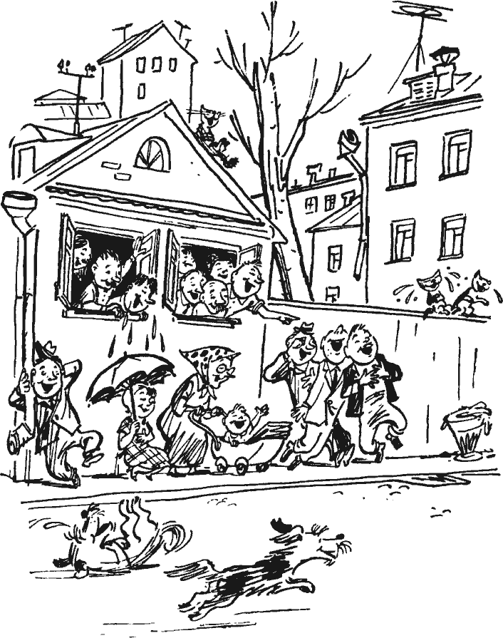 — Но ведь она похожа на чернила! Подоспевший на своей чадящей машине Нетактак Наоборото объяснил Пете: — Совершенно верно — чернила. Это большое удобство! Во-первых, мы избавили наших учеников от необходимости брызгаться чернилами в школе — к их услугам целая река; во-вторых, наши ученики бегают во время уроков к реке и макают в неё свои перья или заправляют самопишущие ручки. И всё это бесплатно, за счёт городского правления. — Ну и ну! — покачал головой Петя и повёл вездеход на мост. Однако ни одна из следовавших за ними колонн и не подумала воспользоваться мостом: все они пошли вброд и на противоположном берегу вышли совершенно перекрашенные. — Молодцы! Правильно пошли! — сказал Нетак. Но Петя, Непоседа и Мякиш молчали. Всё это начинало надоедать, хоть и любопытно было видеть, какие чудеса последуют дальше. Как только они выехали на противоположный берег, который был началом города, на них с диким лаем набросились кошки всех мастей. Нетактак Наоборото выпрыгнул из машины и, несмотря на всю важность своего положения, собственноручно стал разгонять кошек, покрикивая на них: — Ачу! Ачу! Пошли вон, добро пожаловать!.. И путешественники въехали в столицу. Да, прекрасный город Перевертайзо представлял собой весьма необычную картину. О нём стоит рассказать поподробнее. Собственно говоря, на первый взгляд город был как город: дома, улицы, скверы, люди… то есть нетаковцы. Жители планеты выглядели очень своеобразно. Рост и размеры их не зависели от возраста, а зависели от того, сколько в ком было упрямства. Много упрямства — большой нетаковец, мало упрямства — поменьше. Поэтому можно было встретить нетаковца размером с куклу и рядом увидеть упрямца-великана ростом с нормального человека. Другими качествами, кроме упрямства, они не обладали. В столице, как и на всей Большой Нетаке, всё делалось наоборот. Стрелки на часах двигались против хода часовых стрелок, да и сама планета, оказывается, вращалась не в ту сторону… Петя это понял по лёгкому головокружению, которое не покидало его с момента посадки. Короче, порядки в этом городе заставляли Петю только и делать, что удивляться. Заметив замешательство гостя, Нетактак Наоборото поспешил объяснить: — У нас очень порядочные беспорядки! Чувствуйте себя свободно и делайте, что вам вздумается! А Петя слушал и читал объявления.