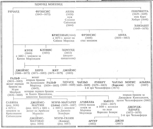 В мае 1680 года вся семья впервые за двадцать лет собралась в Морлэнде. По иронии судьбы, поводом для сбора послужило то, что касалось всех их, – Ральф долго искал такой предлог. В свои сорок девять лет он уже ощущал на плече холодную руку смерти и хотел собрать вокруг себя всех, пока еще был в состоянии сделать это. Он всегда был любимцем семьи, а чрезвычайные обстоятельства его воспитания оставили в душе чувство сиротства и неутолимого голода по нежности и теплоте. Его мать умерла родами, а отец так отличался от всех домочадцев, что Ральф никогда не воспринимал его как отца. Мальчика вырастили дед Эдмунд и приемная бабушка Мэри-Эстер, но их уже давно не было в живых. Потеря первой жены и троих сыновей подряд только усилила этот голод, но женитьба на Аннунсиате немного смягчила его. Как ни странно, чувство сиротства было одним из немногих чувств, роднивших Ральфа с нею. Но он не привык распространяться о своих переживаниях и прятал их в самую потаенную глубину души. Аннунсиата всю зиму занималась будущей женитьбой Хьюго. Порой, теряя терпение, она объявляла, что отзовет свое предложение, потому что маркиз Эли был трудным человеком, очень бедным и очень гордым, что являлось не самым удачным сочетанием. Но в феврале старый маркиз умер, титул перешел к его сыну Масслдайну, и все разногласия по поводу брачного договора были разрешены в силу дружеских отношений молодого маркиза с виконтом Баллинкри. Объявили о помолвке, подписали контракт и назначили венчание на май. Именно тогда Ральф и попросил устроить свадебное торжество в Морлэнде. – В конце концов, он мой приемный сын. Полагаю, что после нашей смерти Шоуз будет принадлежать ему, поэтому он должен жениться там, где живут его подданные. Аннунсиата представляла себе венчание в Лондоне, может быть, в Вестминстере, но Ральфу удалось поймать редкий момент ее расположения к нему, и она согласилась. Масслдайн не возражал против того, чтобы провести месяц в Йоркшире, наслаждаясь гостеприимством Морлэндов. Ральф предусмотрительно разослал приглашения, потратив по этому случаю пять тысяч фунтов, не считая оплаты приданого невесты, поскольку Масслдайн не только не имел ни пенни, но и был обременен многочисленными долгами отца. Аннунсиата не знала, чем обернется ее великодушие, но вынуждена была признать, что Ральф, готовясь к приему гостей, ничего не упустил из вида. Дом вылизали от подвала до чердака, фарфор и хрусталь были вычищены до бриллиантового блеска, слуги одеты в новые ливреи, цветы стояли в каждой комнате. В большом холле Ральф приказал расставить декоративные деревца в горшках, а стены украсить зеленой листвой и гирляндами цветов – создавалось полное впечатление, что попадаешь в сады Эдема. В обрамлении зеленых ветвей висели шелковые знамена с гербами Морлэндов, Макнейлов и Бовери, а над большим камином – огромное изображение черного льва Морлэндов и единорога Бовери, соединенных золотой цепью. Для свадебного стола приготовили множество деликатесов, а главным его украшением был фаршированный павлин и четыре огромных глазированных торта с возвышающимися на них бисквитными часовнями. Кларет и шампанское подавали в больших высоких серебряных сосудах. Оркестр из двенадцати музыкантов играл для гостей, находившихся в доме, а во дворе был накрыт еще один стол для селян и работник