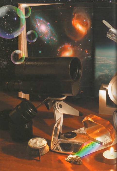 Но зачем нам свет, если мы хотим узнать, откуда взялось вещество? Оказывается, свет может рассказать не только о внешнем виде. Любое сильно нагретое тело излучает энергию. Разогретая печка излучает тепло, раскалённые угли пышут жаром и мерцают красным огнём, а летнее солнце слепит глаза и жжёт кожу. Таково свойство всех веществ и его составных частей, атомов, — возбуждаться и излучать при нагревании. Возьмите щепотку обыкновенной поваренной соли на кончик ножа (химики для этого используют фарфоровую ложечку) и внесите в открытый огонь. Пламя, охватывающее соль, будет окрашено в яркий жёлтый цвет. Именно такой свет испускают при сильном нагревании атомы элемента натрия, входящего в состав соли. А если вы возьмёте другое вещество, которое содержит элемент калий, то пламя будет сине-фиолетовое. Кстати, этот незамысловатый метод до сих пор используют химики, чтобы определить присутствие того или иного элемента в неизвестном веществе или смеси веществ. А пиротехники — для создания разноцветных праздничных фейерверков.