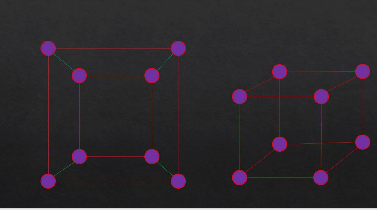 Эта проекция скорей всего является не точной проекцией четырехмерного гиперкуба, по типу, как было раньше с трехмерным кубом. Поэтому, по тому же самому лекалу, мы попробуем снова построить четырехмерный гиперкуб. Мы возьмем трех мерный куб, и разместим его копию внутри первого куба, соединим соответствующие вершины. В результате мы получим трехмерную проекцию четырехмерного гиперкуба, проецируемая на двумерную плоскость. «Четырехмерный гиперкуб или Тессеракт»