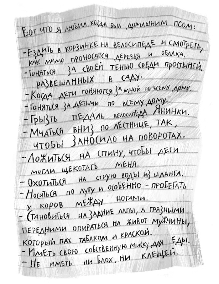 Сейчас уже не мы, а наши щенки резвятся в саду между развешанными простынями, гоняются за своей тенью или струёй воды из шланга. Но мне по-прежнему нравится лечь на спину, и чтобы дети щекотали мне живот пальцами босых ног. И я всё ещё люблю пожевать педаль велосипеда Янинки. Иногда я нежусь на солнышке и мечтаю о том, как было бы здорово записать нашу историю. Но мы, собаки, не умеем ни писать, ни говорить. А иногда мне кажется, что Янинка всё понимает. Она часто пишет что-то в своей тетрадке, на обложке которой нарисована чёрная собачка. Может, это и есть наша история, которую моя девочка пишет за меня? Раз уж читать я не умею, я просто кладу лапу на первую страницу и представляю себе, что там написано: Однажды холодным утром я бежал вдоль реки и вдруг почувствовал слабый запах Янинки.