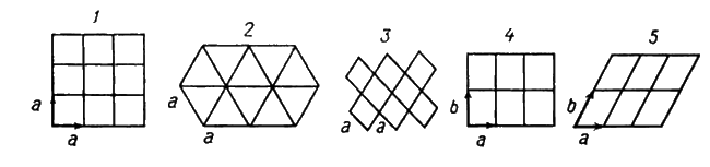 Рис. 2. Пять типов плоских параллелограмматических решеток 1 — квадратная, 2 — гексагональная, 3 — ромбическая, 4 — прямоугольная, 5 — косоугольная