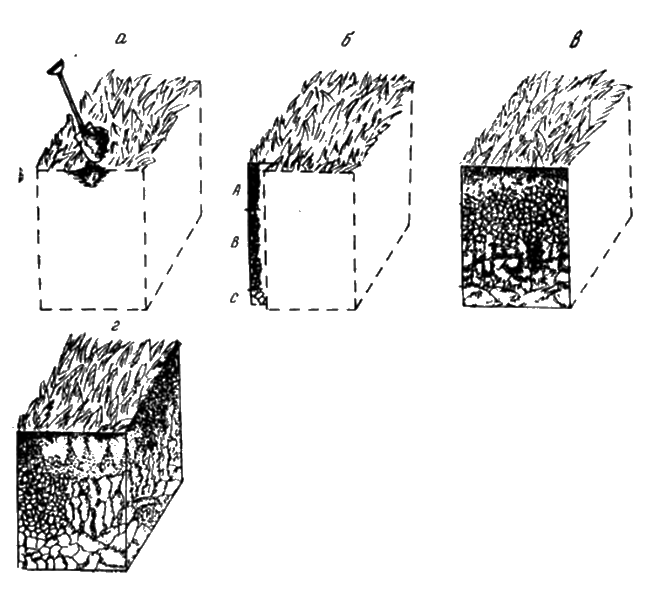 Важным шагом к углубленному пониманию природы почв был переход от нульмерной почвенной модели к одномерной. В. В. Докучаев совершил этот переход, проведя вертикальную линию от дневной поверхности до подстилающей горной породы (рис. 5, б) и разделив ее на три неравных отрезка: А, В и С, каждый из которых соответствовал почвенному горизонту. Вместе они образовали единое целое — профиль почвы.