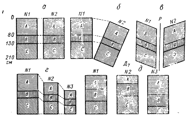 Рис. 6. Классификация почвенных профилей по характеру движений а — конгруэнтное совмещение, б — поворот, в — зеркальное отражение, г — равномерное сжатие, д — цветная симметрия