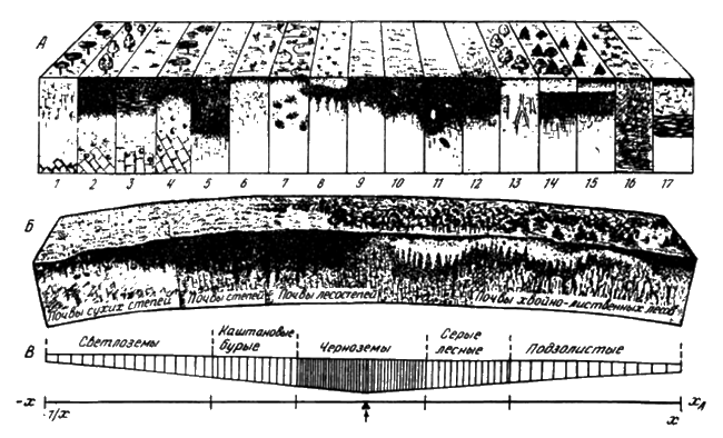 Рис. 10. Модели структур горизонтальной почвенной поясности А — Фитцпатрика, Б — М. М. Филатова, В — С. А. Захарова Почвы: 2–2 — ферралитные, 3 — железистые, 4 — камбисоли, 5 — вертисоли, 6 — сероземы, 7 — солончаки, 8 — солонцы, 9—10 — каштановые, 11–12 — черноземы, 13 — дерново-подзолистые, 24 — лессиве, 15 — подзолистые, 16 — болотные, 17 — глеевые
