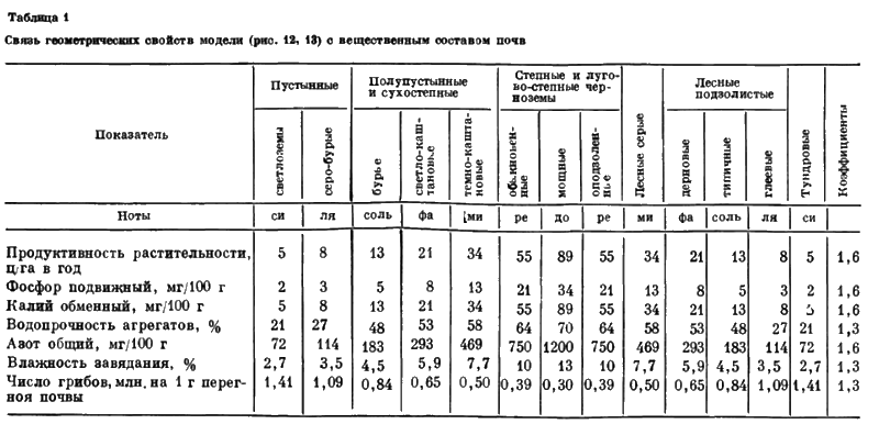 Некоторые читатели подумают: «Да это же игра в фиктивные цифирьки! Мистика! Что же получается: цифры управляют миром?» На это можно ответить словами великого Гете: «Числа не управляют миром, но показывают, как управляется мир». И доказать это могут только абстракции, модели. Вспомним их предназначение с помощью простых идеализированных (!) построений найти такое соотношение чисел, которое позволило бы проникнуть в качество изучаемого объекта. Установление постоянных величин (1,6; 1,3) свидетельствует о том, что почвенные профили Земли упорядочены по законам симметрии. И в пространстве они располагаются симметрично. Иначе не может быть. Природа создает свои объекты энергетически целесообразными, компактными, правильными. Разве почва — случайное на Земле тело? Конечно же, почва возникла не по воле случая; она — составная часть биосферы и подчиняется всем правилам ее возникновения и эволюции. А раз это так, то не следует удивляться и тому, что все почвенные структуры на Земле упорядоченные и могут быть выражены строгими рядами чисел (Соркин, 1982). Казалось бы, далекие по свойствам пары почв: серобурые —подзолистые глеевые, светло-каштановые — подзолистые дерновые и другие — вдруг оказываются сходными по геометрической структуре профилей. Это сходство вскрывает тождество вещественного состава указанных пар профилей. Видимо, модель можно рассматривать как триадную, имеющую две стороны — левую, правую и середину, или правое кислотное плечо, левое щелочное плечо и нейтральную область в центре. Попробуем проникнуть в суть понятий «левизна» и «правизна», на существование которых в геометрии земного пространства указывал В. И. Вернадский. Для понимания природы «левизны» и «правизны» почвенного пространства прибегнем к аналогии, сравнив горизонтальную почвенную поясность (см. рис. 12, 13) с клавиатурой фортепьяно. Ведь ноты в каждой октаве одинаковы, но отличаются высотой звука. В этом сравнении еще не все понятно. Многие при построении абстрактных схем привыкли понимать почвенный покров как континуум. Но эта континуальность, очевидно, образована дискретностью, как звукоряд: он един, непрерывен, но построен из самостоятельных звуков. Вспомним аналогии Высоцкого, Захарова, Афанасьева, касающиеся свойств почв севера и юга России. Они наводят на мысль о сходстве природы горизонтальной и вертикальной поясности с музыкальными октавами. Предшественник Д. И. Менделеева английский химик Джон Ньюленде в 1865 г., изучая периодическую повторяемость свойств элементов, подметил, что каждый восьмой элемент в его схеме напоминает по свойствам исходный элемент, с которого начинается счет. Это позволило прибегнуть к музыкальной аналогии и назвать установленную периодичность свойств элементов законом октав. И хотя Ньюленде ошибся в расчетах, его аналогия сыграла огромную роль в науке. Как видно из рис. 12, 13, почвы в ряду горизонтальной зональности располагаются подобно нотам в музыкальной гамме. Здесь каждая «нота звукоряда» повторяется через семь других основных «звуков». Эту зависимость можно назвать «законом почвенных октав». Она означает, что у почв, расположенных в ряду по величине увеличения (или уменьшения) мощностей горизонтов, обнаруживается периодическое повторение некоторых фундаментальных свойств, например геометрических, через ка