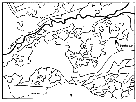 Основоположники почвоведения — В. В. Докучаев и Н. М. Сибирцев — понимали, что для установления структуры почвенного покрова надо сначала выявить его целостность, а в ней — естественные элементарные ячеи, находящиеся между собой в определенных отношениях. Н. М. Сибирцев ввел в научный обиход термин «пластика рельефа» (1951, с. 316). Он считал, что «почвенные пятна и ленты суть вместе с тем пятна п ленты рельефа» или что в почвообразовании «главное значение имеет рельеф местности, всегда отражающийся (почти с фотографической точностью) на характере почв». В. Р. Волобуев (1948) разработал метод пластики, закартировав с его помощью рельеф и почвы Кура-Араксинской низменности (см. рис. 23). Министерство мелиорации и водного хозяйства СССР, утвердив метод пластики в качестве основного при картографировании почв, рельефа и грунтовых вод, сделало его достоянием широкого круга практиков. В. А. Ков да (Временная методика…, 1984) считает, что за методом пластики большое будущее, особенно если его сочетать с аэрокосмическими снимками. Кратко изложим суть этого метода. Допустим, рельеф какой-то части суши (рис. 29, А) запечатлен геодезистом на топографической карте (рис. 29, Б). Нужно, не упрощая рисунка рельефа топокарты, выделить все его формы двумя элементами, т. е. с помощью повышений (они заштрихованы) и понижений (рис. 29, В), Ареалы (В) и дадут новую карту — пластики рельефа. Эта карта является основой для составления почвенной карты нового типа — динамической, которая отличается от традиционной почвенной карты — статической.