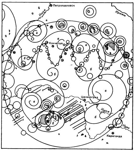 Рис. 16. Фрагмент карты почвенных структур Казахстана. Спиральные, кольцевые (а, б), синусоидальные (в) и линейные (г) структуры