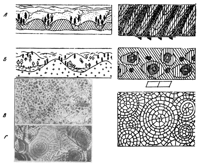 Рис. 1. Естественные поверхности почвенного покрова (слева) и их схематическое изображение (справа) А, В, В — тундра: А — Аляска, дельта р. Икпикпук, в 100 км от м. Барроу (по Дайсон, 1966), Б — Ямал, р. Каралуах, горы Бырранга (по Гусеву, 1938), В —Аляска (Fitzpatrik, 1980); Г — песчаная пустыня Каракум в Туркмении (Федорович, 1983)