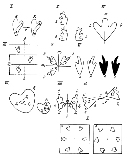 Отражение — особый вид движения, с помощью которого можно обнаружить на почвенной карте или аэрофотоснимке зеркальную симметрию. Для этого зеркальце ставят гранью к плоскости карты и ищут сходство в расположении ареалов. Оно необычное — зазеркальное (рис. 25, III): ареал А становится двойником ареала С, но в ином пространственном порядке. Зеркальное отражение встречалось на рис. 11–13, где плоскость симметрии преобразовала одну часть модели в зеркальный двойник по отношению к другой ее части. Таким же свойством обладает и почвенный ареал, показанный на рис. 25, III, Каждая его половинка зеркально асимметрична. Такие половинки единого целого ареала называются энантиоморфами. Чтобы отличить одну половину от другой, вводят понятия «левый» (L) и «правый» (D) энантиоморфы. Такое состояние ареала еще называют зеркальной асимметрией, или лево-правой асимметрией. Эта асимметрия широко распространена в природе. Комбинированное отражение с переносом выявляет новый тип симметрии, отвечающий скользящей плоскости, или, точнее, оси симметрии (рис. 25, IV). Такое периодическое, с интервалом в 2а, повторение ареалов вдоль оси О А, т. е. перенос с последующим отражением относительно О А, называется бордюром и более подробно описывается ниже. Есть ли еще какие-либо виды движений зеркалом, которые выявили бы периодическое повторение почвенных ареалов на карте? Их много. Так, можно пользоваться не одним, а двумя, тремя и более зеркалами. Их ставят различными способами и под различными углами, получая разные отражения и комбинации отражений. Можно брать не простые, а «цветные» зеркала, образующие с простыми сложные типы симметрии, которые характеризуют периодическую повторяемость не только самих форм почвенных ареалов, но и их вещественных свойств. Одно зеркало позволяет увидеть сам ареал А, его отражение В в зеркале и отражение отражения С в зеркале т2 (рис. 25, V). Угол между зеркалами равен 90°, а последовательные отражения от зеркал составляют поворот на 180°. Ареал А при повороте на 180° совпадает с ареалом С: зеркальная и вращательная симметрии совмещаются. Это свидетельствует о том, что данные почвенные ареалы обладают высокой устойчивостью структур. С зеркальным отражением и конгруэнтным совмещением связана важная для почвоведения симметрия — антисимметрия. В антисимметрии имеется четыре вида равенства (рис. 25, VI): 1) а-а, б-б — отождествление, 2) а-б, в-г — зеркальное равенство, 3) a-в, б-г — антиотождествление, 4) а-г, б-в — зеркальное антиравенство Конгруэнтная операция совмещает ареалы (1), а операция отражения от бесцветного зеркала m(2) превращает правый почвенный ареал (D) в левый (L). Операция антиотождествления (3) соответствует перемене цвета при конгруэнтном наложении одного ареала на другой. Это означает, что, хотя почвенные ареалы равны по геометрической форме, они отличаются по вещественному составу, например по содержанию гумуса. Отражение в цветном зеркале (4) приводит к такому равенству, при котором меняется окраска, т. е. вещественный состав: левое превращается в правое, или, иначе, свойства почв при сходных формах меняют знак на противоположный.