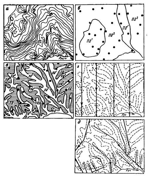 Рис. 30. Детальные карты территории совхоза в Белоруссии а — топографическая карта, б — составленная по топокарте почвенная карта, в — составленная по топокарте карта пластики рельефа. Черные точки — места расположения почвенных ям. Проведение дренажной сети, г — без учета карты пластики рельефа, д — то же, но с учетом пластики рельефа