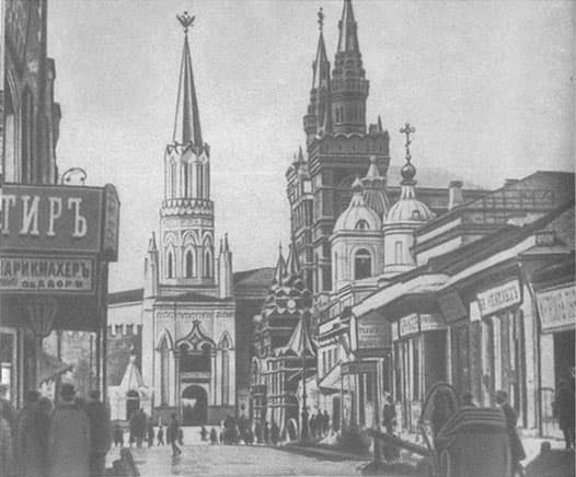 Старинные торговые ряды, возобновленные после наполеоновского нашествия и разгрома, занимали огромный квартал в самом центре Москвы, между улицами Никольской и Ильинкой (теперь улицами 25 Октября и Куйбышева) — с фасадом по Красной площади, напротив зубчатой Кремлевской стены, перед современным Мавзолеем. Ряды эти составляли тоже своего рода московскую достопримечательность. Перед центром их фасада в те времена стоял памятник, с двумя фигурами отечественных героев и с золотой надписью на темном граните: «Гражданину Минину и князю Пожарскому благодарная Россия». Но недаром говорил Гоголь устами городничего: «Где-нибудь поставь какой-нибудь памятник или просто забор, — черт их знает откудова — и нанесут сюда всякой дряни!» Хорошо помню я этот памятник, передвинутый в настоящее время к древнему собору Василия Блаженного. Он стоял, окруженный сквозной невысокой решеткой, обращенный тыловой стороной к рядам; правая рука гражданина Минина, протянутая во всю длину, указывала на Кремлевскую стену, за которой возвышалось громадное здание Окружного суда* с круглой невысокой колонкой над крышей; на колонке была золотая надпись Закон, и увенчана она была сверху царской короной, что было символом российского закона и означало эмблему высшей справедливости, которая с таким жестоким остроумием высмеяна в знаменитой эпиграмме:XVII