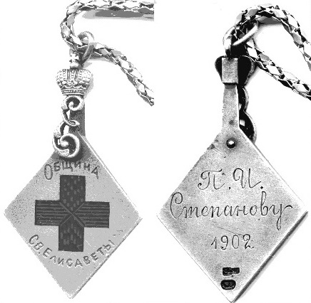1902 г. Наградной знак дедушке Петру Сын Ивана Пётр тоже работал на золотых приисках. Но в отличии от отца был деловым, основательным, имел хорошее хозяйство. Рассказов и подробностей о нём сохранилось немного. Один сохранившийся в памяти эпизодоврассказан бабушкой Анной, участницей этого события. Они с мужем и четырьмя своими детьми возвращались с приисков на пароходе. Очевидно, что вместе с ними были и другие добытчики, и все везли с собой золото. Во время плавания на пароход напали грабители и под угрозой для жизни пассажиров и их детей всех ограбили. Даже бывалые люди были напуганы, а тем более дети. Одна из сестёр мамы стала после этого плохо слышать и говорить, другая всю жизнь страдала сильнейшими мигренями, а совсем маленькая мама тяжело заболела. Бабушка боялась, что она умрет в пути и ее выбросят за борт (наверное, была жара и плыли долго). Тем не менее какое-то количество золота, спрятанное в одежде бабушки и детей, сохранилось и в дальнейшем семья не бедствовала. Об этом можно судить хотя бы потому, что у них была собственная крупорушка и маслобойня. Мама считала, что всё это было куплено на привезённое золото, к тому же она предполагала по что и лжесвидетельство её деда тоже было не бескорыстным. Может быть, для искупления греха своего отца дедушка Пётр много жертвовал на благотворительность. Сохранился именной серебряный знак, которым его наградила за это Великая княгиня Елизавета Фёдоровна. Также как и семья отца, семья матери подверглась раскулачиванию. Формальной причиной было наличие в доме наёмного работника — молодого парня, который был дальним родственником. Дедушка Пётр Иванович к тому времени умер, и бабушка осталась одна с малолетними детьми. В колхоз она не вступила и продолжала выживать, как могла. Её дочь Елена вспоминала, что однажды они с сестрой возвращались с полевых работ на телеге, запряженной быками. Быки чего-то испугались и понесли, телега перевернулась и все оказались в логу. Девочки со слезами бессилия пытались вытащить телегу и поднять быков, а мимо проезжали с песнями колхозники, но никто не помог. Наверняка среди них были и те, кто пил на деньги отца этих детей. Дедушка был очень строгим, и бабушка не перечила ему ни единым словом. Так, перед Пасхой приезжали в гости родственники из деревень, чтобы и церковь посетить, и у родных погулять. Они останавливались в семье Петра и проходили в чисто прибранный дом с добела отмытыми и отскобленными полами прямо в грязных сапогах. И бабушка не могла им делать замечаний. Бабушка запомнилась мне тихой, с красивым правильным лицом и совершенно белыми седыми волосами, заплетёнными в косы. Её смерть была первой, которую я помню. Мы уже жили в городе, а она оставалась в селе, и я редко там бывала. Поэтому большой утраты не чувствовала и воспринимала произошедшее только как страшное явление. Я избегала смотреть и на лицо умершей, и на гроб, но всё равно видела его боковым зрением — он отражался на блестящей поверхности самовара, когда мы сидели за столом. Слёзы полились рекой только на кладбище, когда запели "Со святыми упокой, Христе души раб Твоих, идеже несть болезнь, ни печаль, ни воздыхание, но жизнь бесконечная". С тех пор не могу без слёз и волнения слушать прекрасные, одновременно трагичные и полные надежды слова этого канона. В период раскулачивания оставшееся